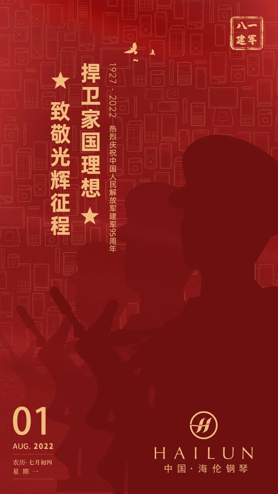 一腔豪情,奏响时代颂歌 一份忠诚,歌颂祖国强大 他们 热血!坚定!无畏!无悔! 他们,就是中国军人 今天是八一建军节 中国人民解放军成立95周年 海伦钢琴向 “钢铁长城”般的中国军人致敬